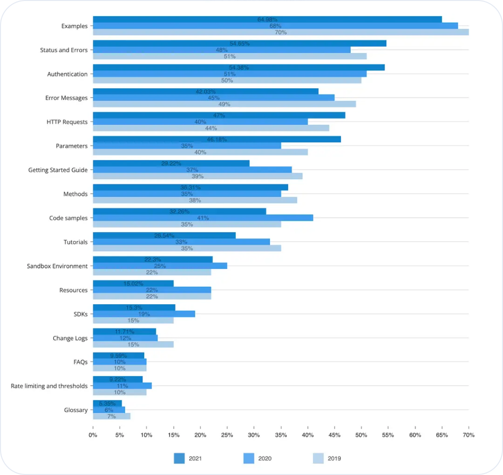 Developers want working examples first and foremost. Clear “copy-paste” snippets and real usage scenarios help them understand how the API behaves in practice, reducing guesswork and speeding up integration. In SmartBear’s study, examples were the most selected item among docs features.